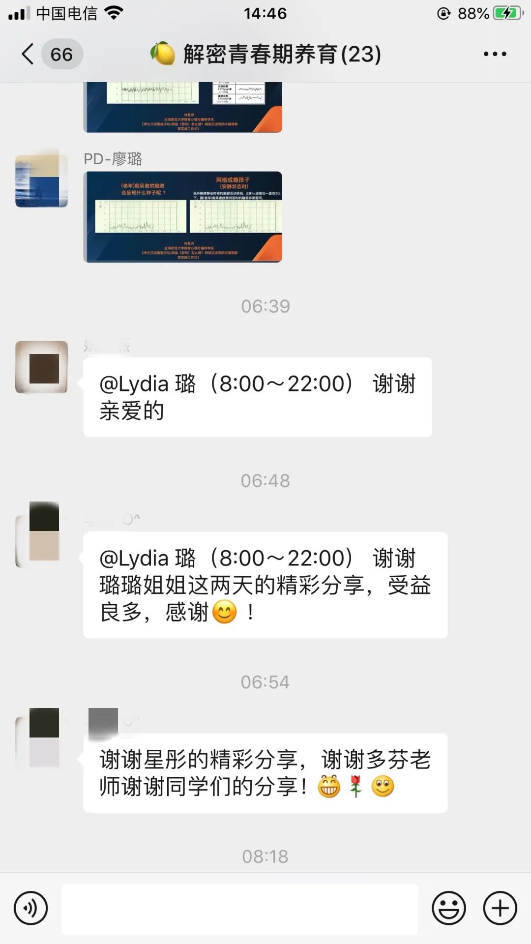 课程结束后,家长们都说收获好大,对于养育青春期的孩子也更有信心了。被学员们感谢的时候,觉得自己的价值感满满呀。
